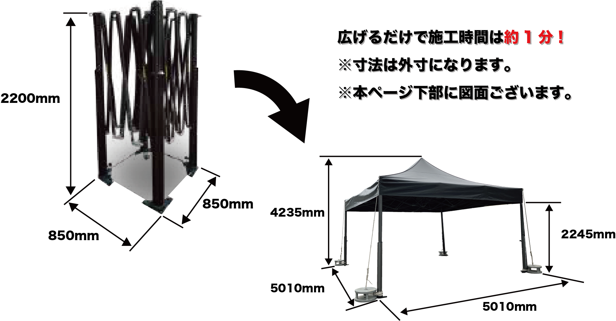 高さ 4235mm/幅 5010mm×5010mm  収納サイズ850×850×2200mm